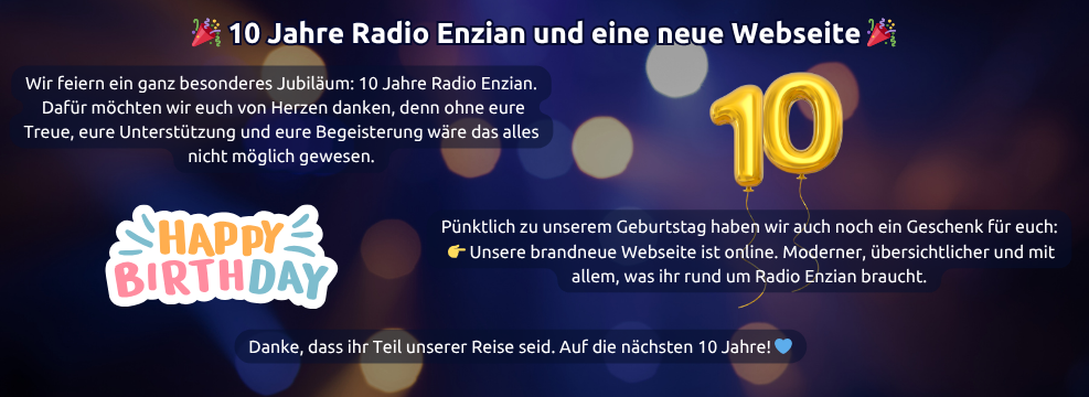 Schön dass du hier bist. Bei uns findest du Musik, die gute Laune macht, spannende Sendungen und ein Programm das dich den ganzen Tag begleitet. Mach es dir bequem und genieße dein Radio Enzian.